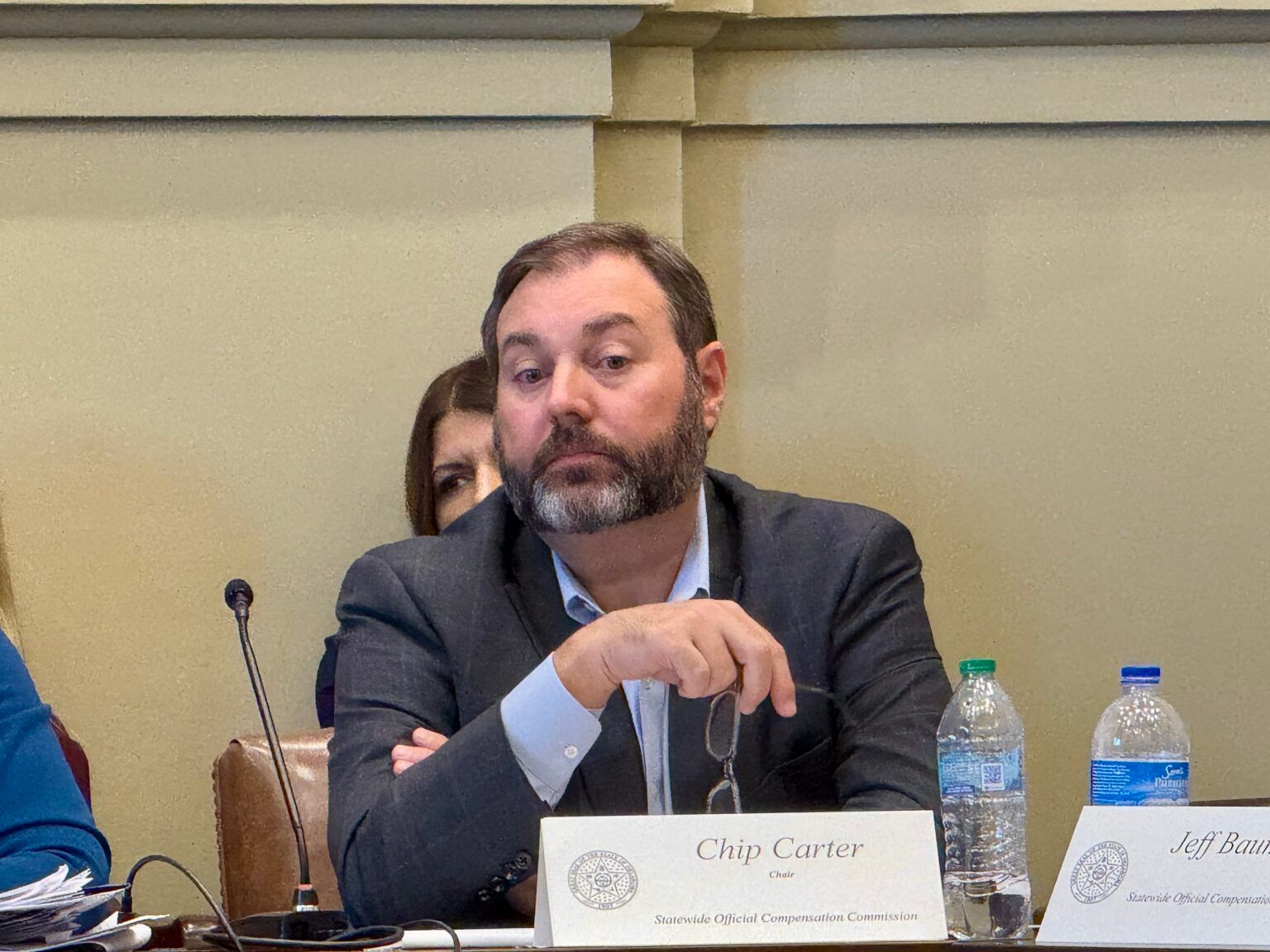David “Chip” Carter, chair of the Statewide Official Compensation Commission, listens to a motion to raise the salary of various elected officials at a meeting at the state Capitol on Nov. 18, 2025. (PHOTO by Emma Murphy/Oklahoma Voice)