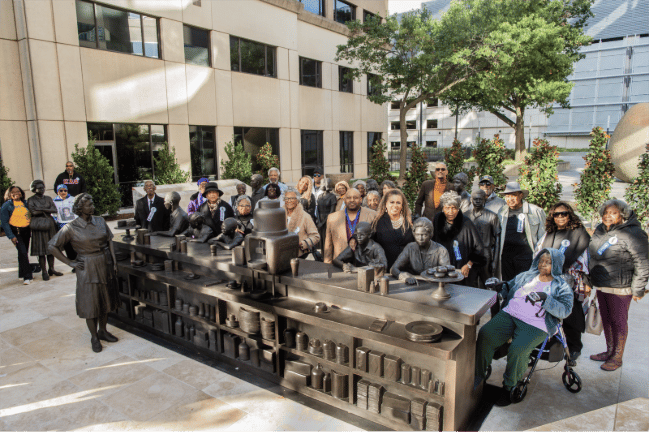 A 4-ton bronze lunch counter featuring life-sized depictions of the 13 student sit-inners, Clara Luper and a Katz Drug Store employee.
