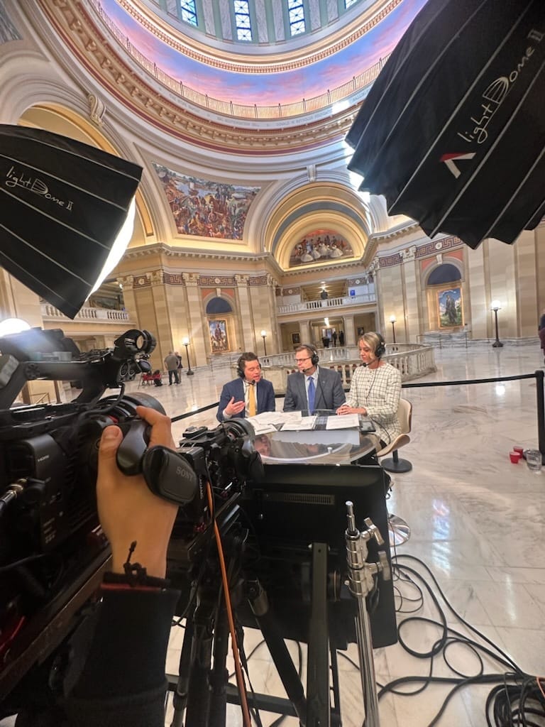 Jonathan Cooper, Scott Mitchell, and Haley Hetrick from Griffin Media cover the ‘State of the State’ address at the Oklahoma State Capitol on Monday. (PHOTO by Kylie Frakes)
