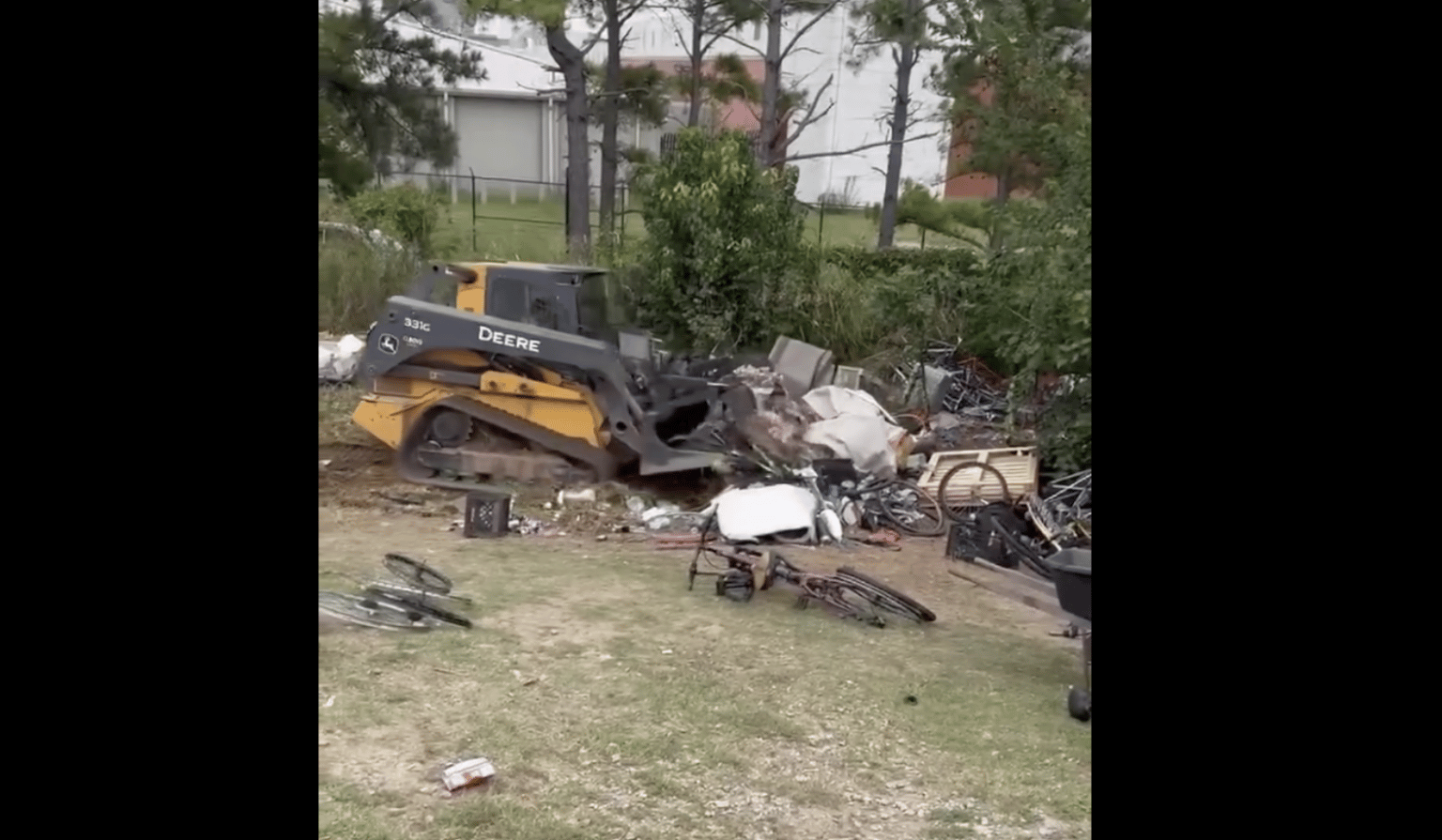 Crews use a front loader to clean up a former homeless camp on state property in Tulsa. (Screenshot of Operation SAFE video footage)