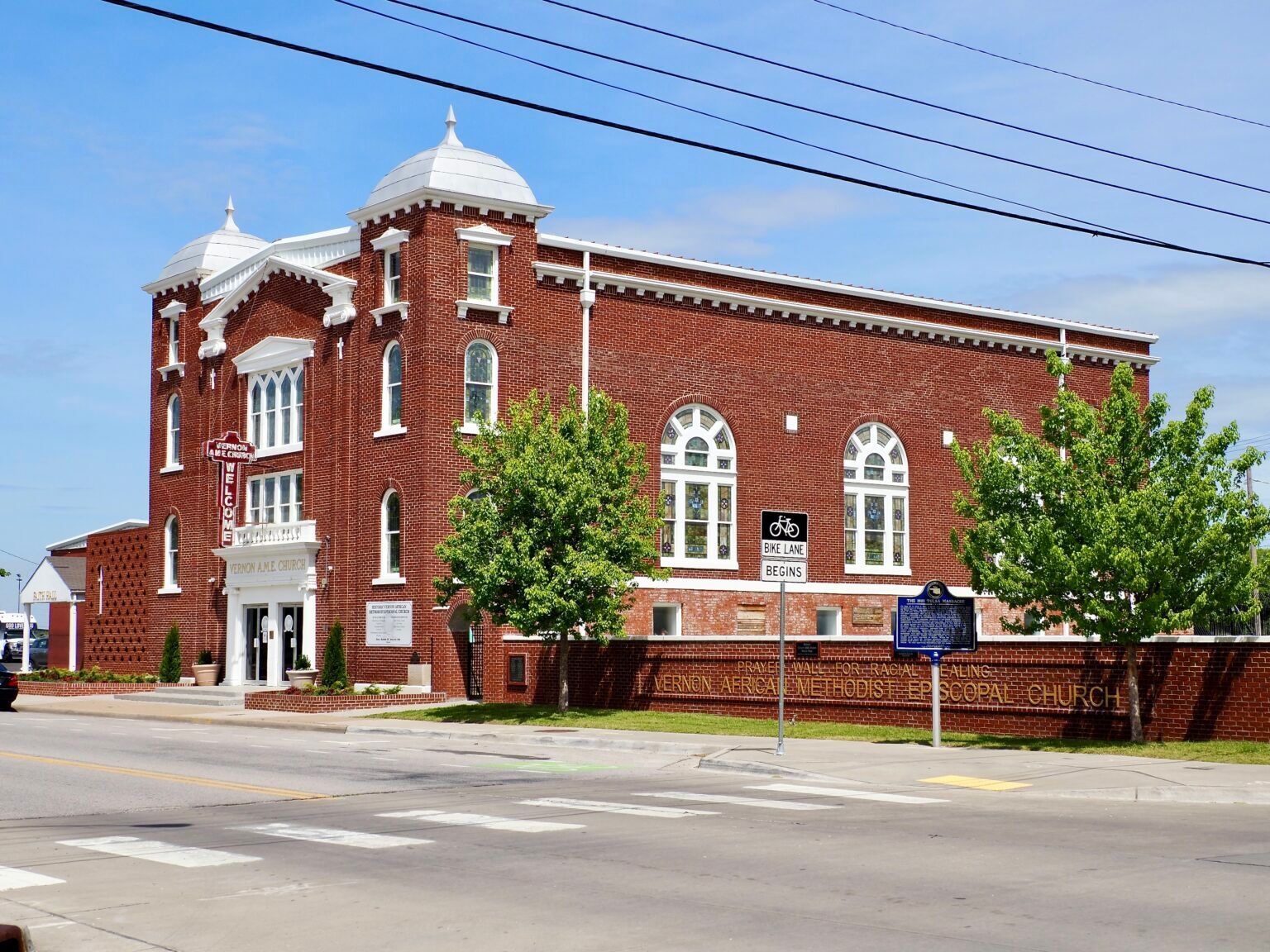 Vernon African Methodist Episcopal Church stands on North Greenwood Avenue in Tulsa. The church was rebuilt after being destroyed in the 1921 Tulsa Race Massacre. (PHOTO by Nuria Martinez-Keel/Oklahoma Voice)