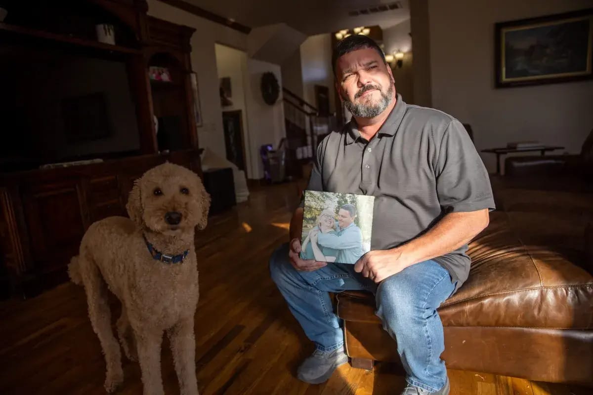 Bradley Cox at his home in Edmond, holding a photo of his wife, Farah. (PHOTO by Brent Fuchs / Oklahoma Watch)