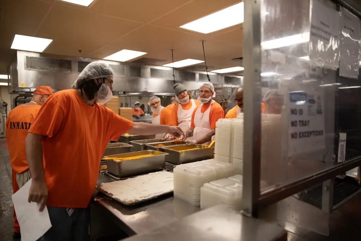 Prisoners work in the kitchen of the Joseph Harp Correctional Facility on Oct. 10, 2024. (Brent Fuchs/Oklahoma Watch)